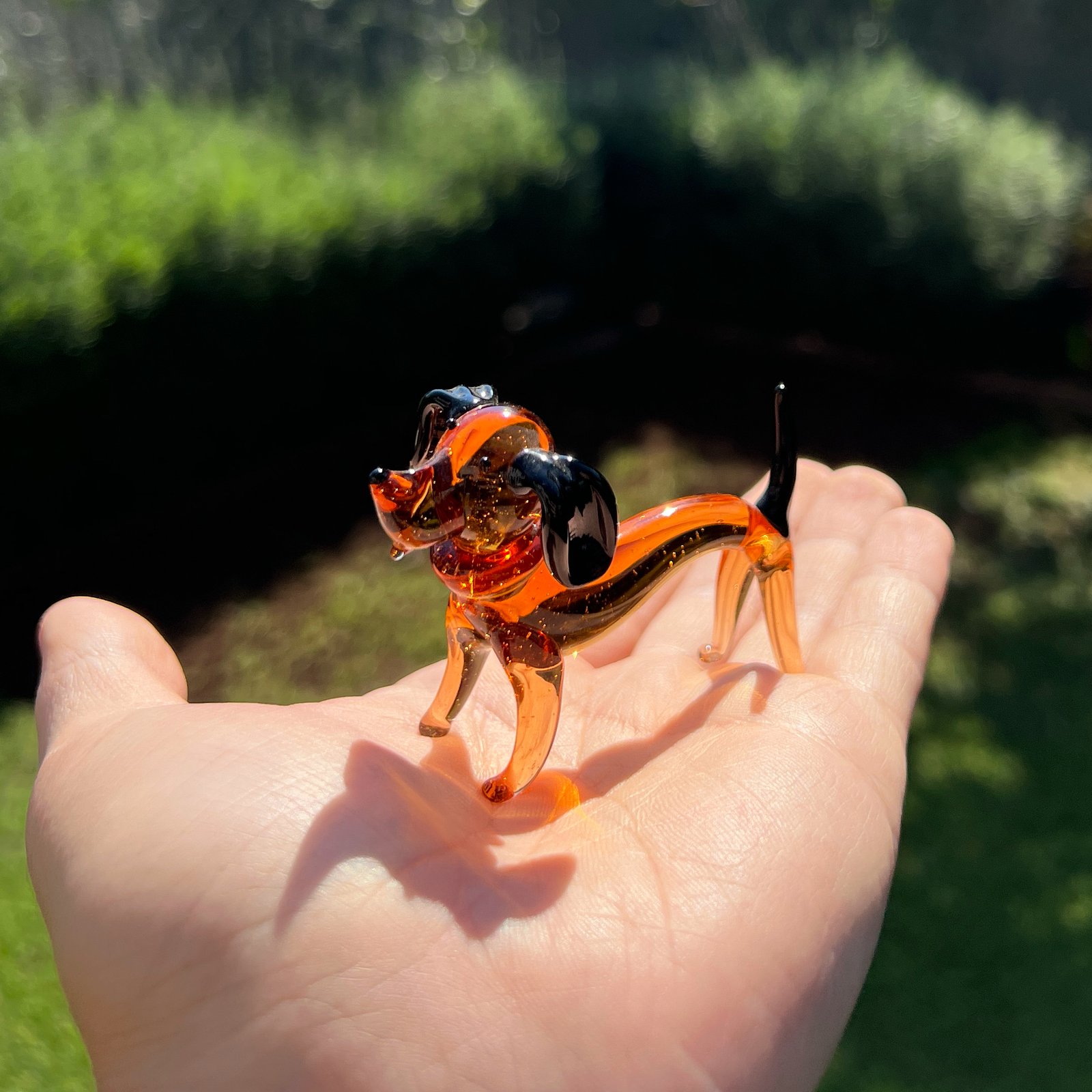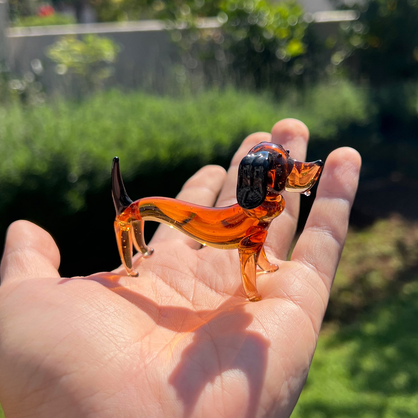 This brown sausage dog from our miniature series is full of personality, with its head lifted and tail perked up in a gentle wag—clearly hoping to charm its way into your heart. Crafted from warm tea-brown glass, its color closely resembles that of a real dachshund, while the way it catches the light gives it a jewel-like, amber glow.