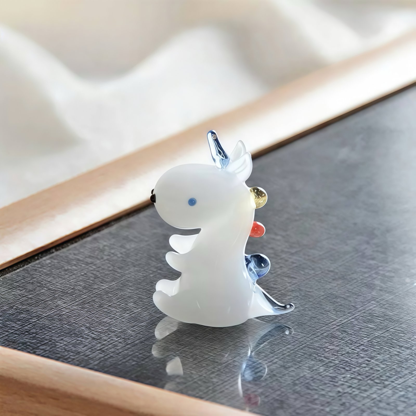 This mini unicorn features a charming seated pose, with a sky-blue horn rising from its forehead and a tricolor fin—red, yellow, and blue—accenting its back. The body has a jade-like translucence, soft and luminous, giving it both a playful cuteness and an ethereal, almost sacred presence. A small figure with big character.