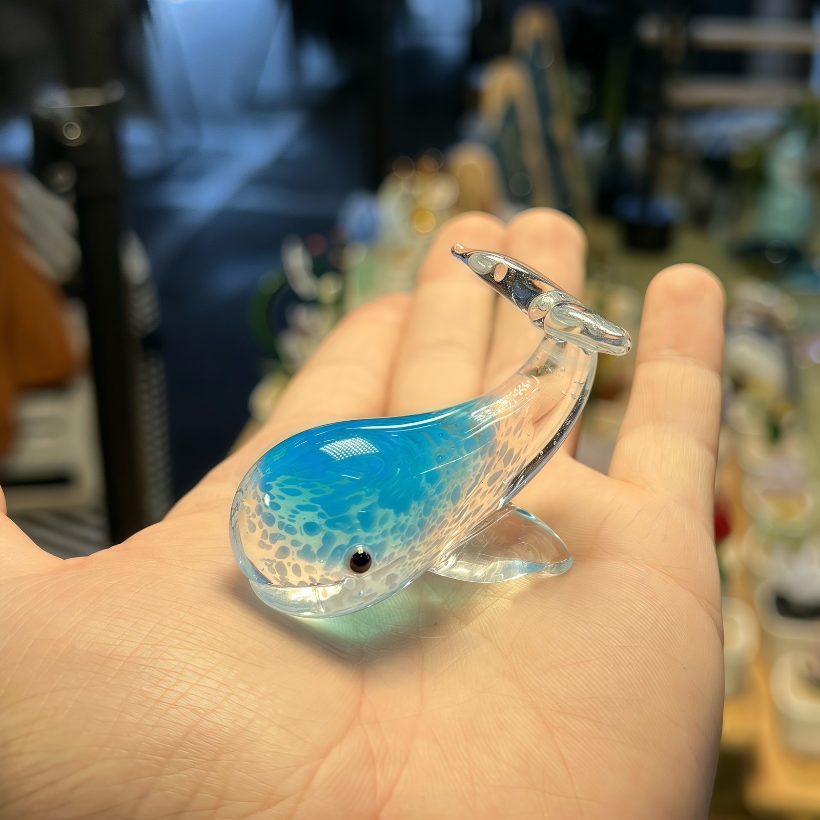 This mini whale features a translucent body adorned with light blue spots, evoking the shimmering effect of sunlight dancing on its skin as it glides just beneath the water’s surface. Its gently lifted tail gives the sense that it’s about to rise and exhale a playful burst of water — a small moment captured in glass, full of movement and charm.