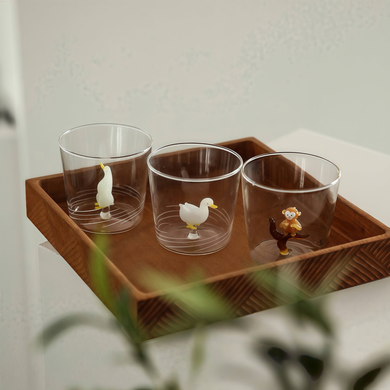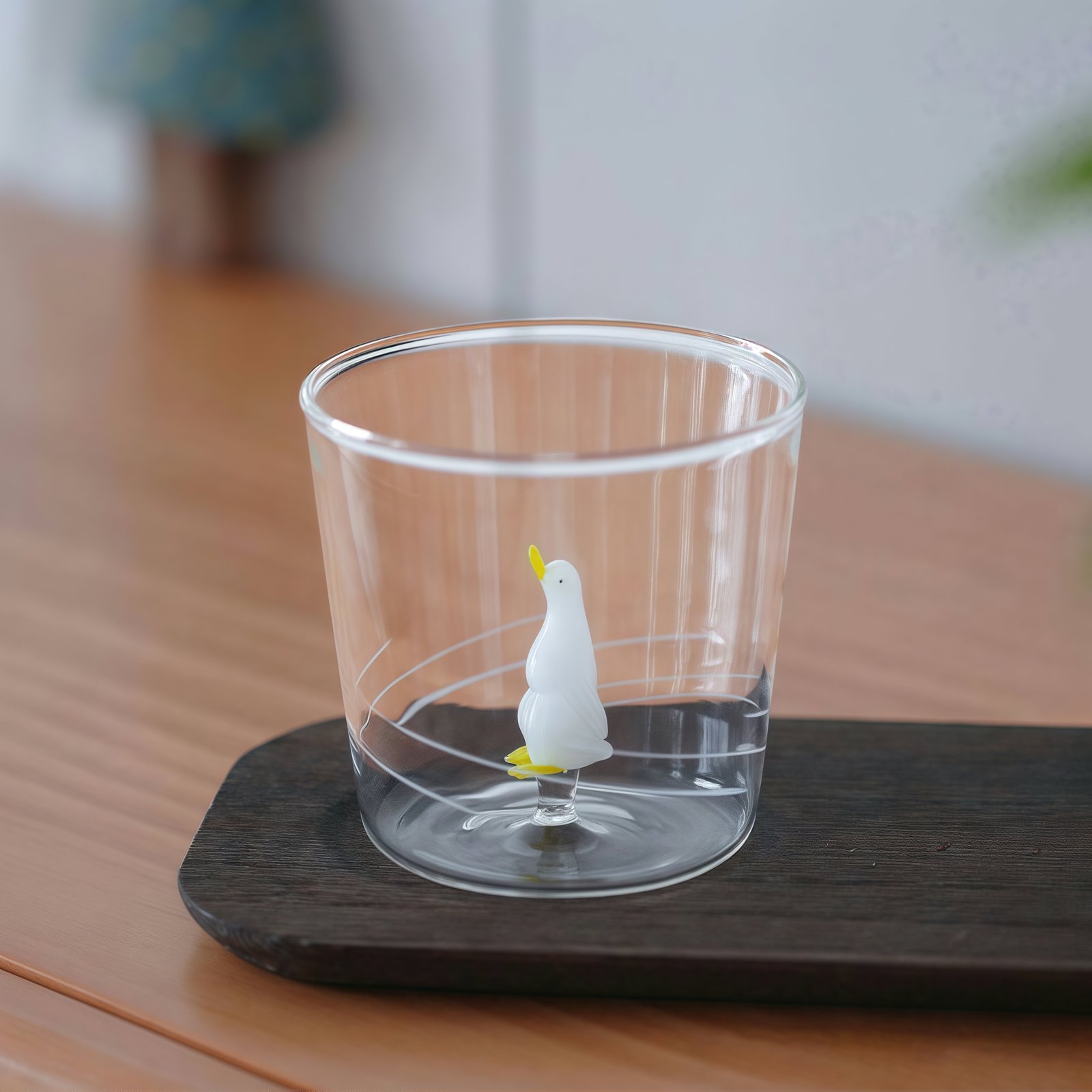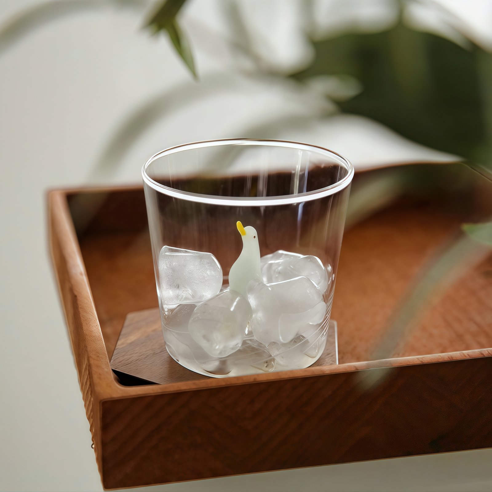 This cup is part of our Animal & Plant Glassware Series, featuring a charming duckling with its head tilted upward. Crafted as a handleless glass tumbler, this piece belongs to our premium tumbler line, designed not only for function but also for visual delight.