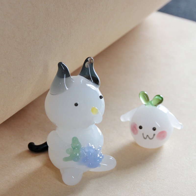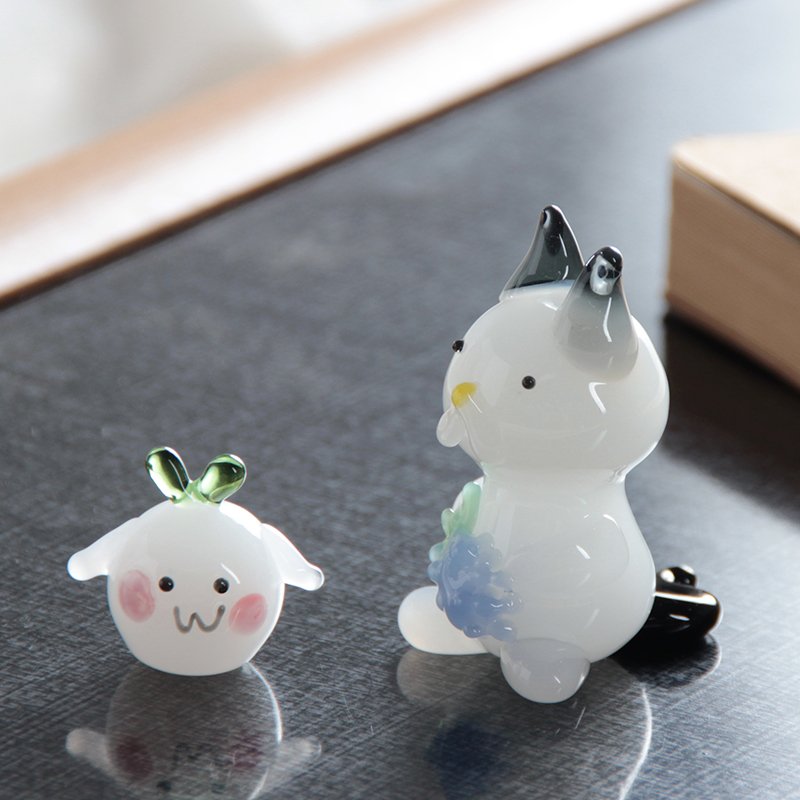 This little Siamese cat sits sweetly, holding a bunch of grapes as if waiting to offer them to someone special. With its wide-eyed, gentle expression, it brings a quiet charm that fits beautifully into any miniature scene. You can pair it freely with our other mini animals, or, like us, place it alongside a tiny forest sprite for a touch of whimsy.