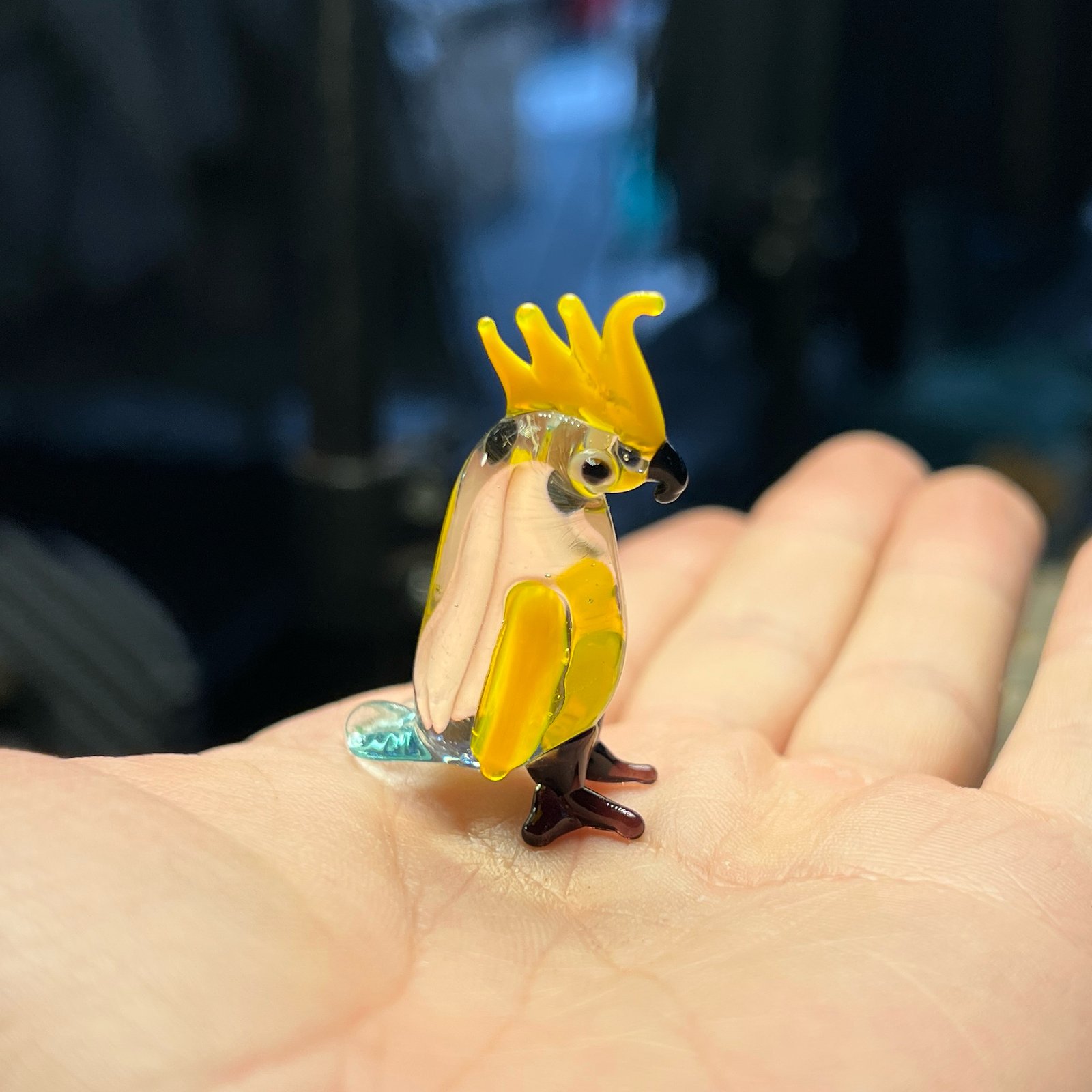 This charming mini cockatoo features a delicate yellow crest and thoughtfully crafted details—from its layered crown feathers and clear-glass eyes to its curved beak and slightly raised tail. Though small in size, it captures the essence of the bird with impressive precision. If you’re a bird lover or collector of fine miniatures, this little parrot is sure to brighten your day.